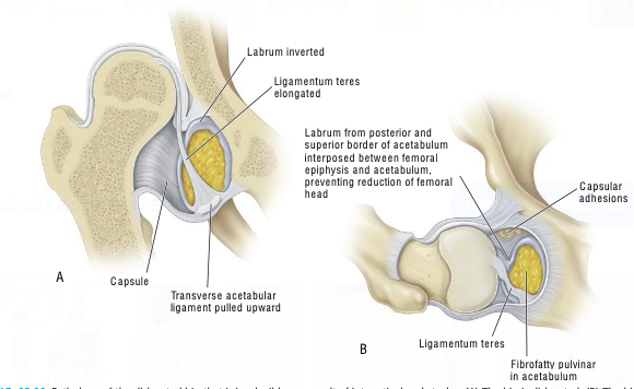 Incluem redução inadequada, displasia residual do fêmur e do acetábulo, e necrose avascular da cabeça femoral.