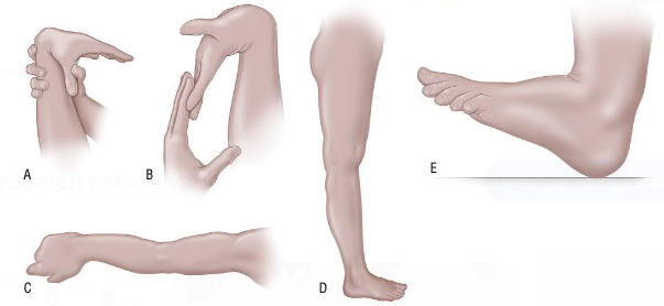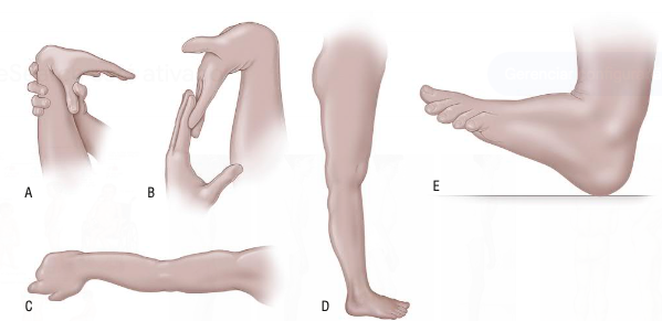 Incluem extensão passiva do polegar ao antebraço, hiperextensão ativa do cotovelo e joelho, e dorsiflexão do tornozelo.