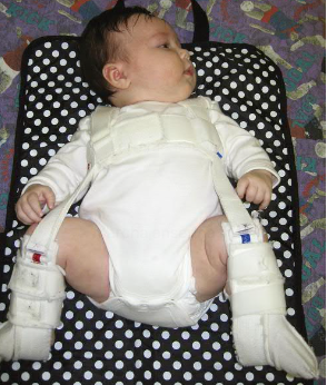 Uso da órtese de Pavlik para manter o quadril em flexão e abdução.