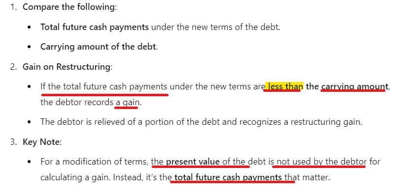 How do you determine if there’s a gain on troubled debt restructuring involving only a modification of terms?
