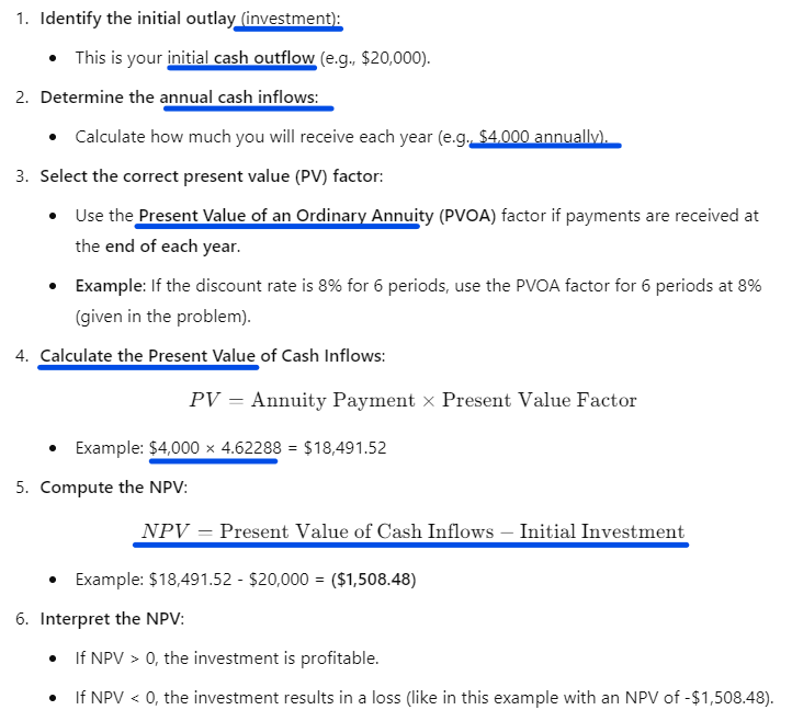 How do you calculate the Net Present Value (NPV) of an investment?