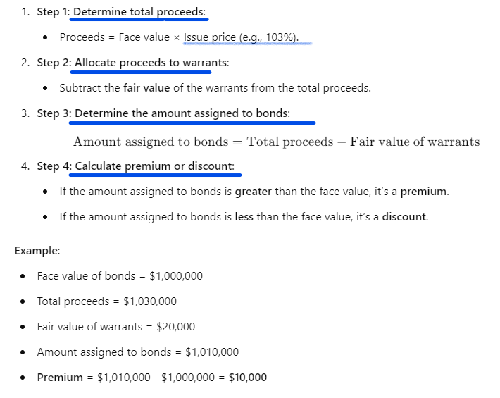 How do you calculate the premium or discount on bonds issued with detachable warrants?
