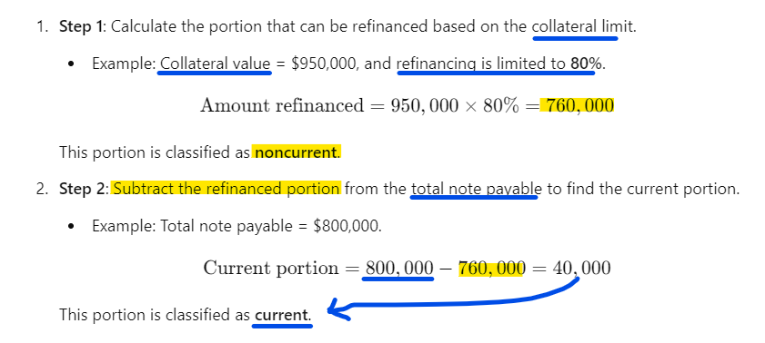 How do you classify a note payable as current or noncurrent when it is being refinanced given collateral and a limit