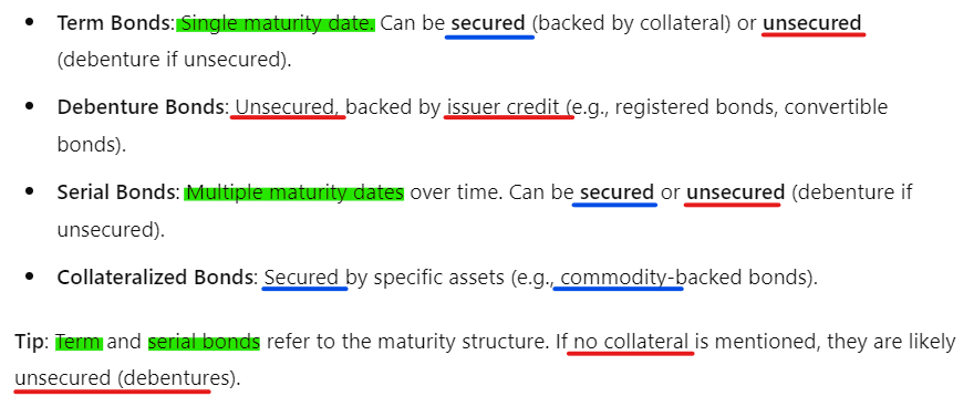 How do you classify term, debenture, serial, and collateralized bonds?