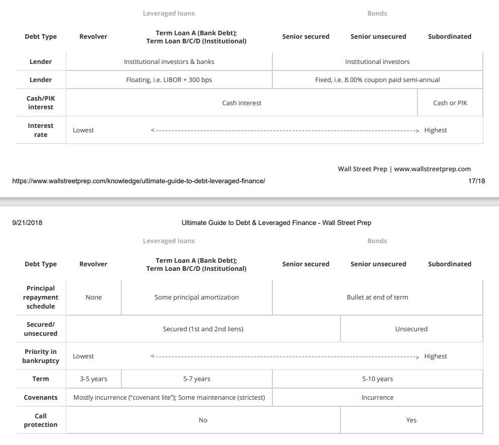 Tell me about all the different kinds of debt you could use in an LBO and the