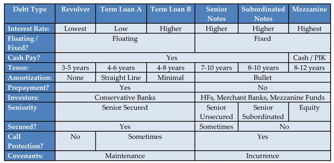Tell me about all the different kinds of debt you could use in an LBO and the