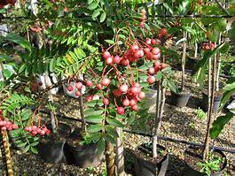 Fern-like leaves with many leaflets turning purple in autumn. Flat heads of creamy-white flowers followed by crimson fruits fading to near white