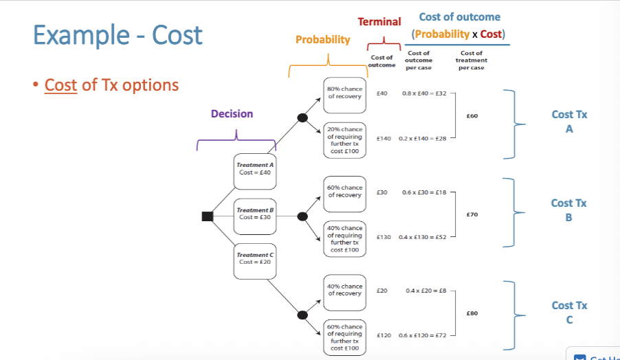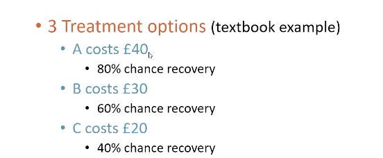 - E.g. Drug A (cheaper and does not work as well vs Drug B more expensive but works better; what are the pros and cons/risks - must be weighed).