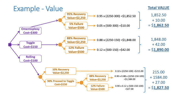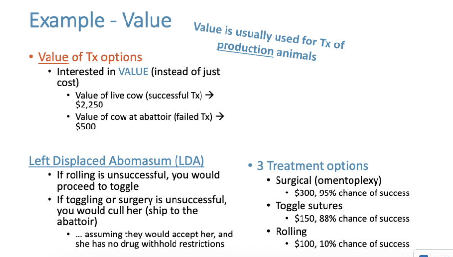 From a cost perspective, tell farmer to do toggling. However, farmer needs to know there is a 12% chance of the cow dying. So if life is more valuable for producer, toggling has a higher risk so they should choose Omentoplexy.