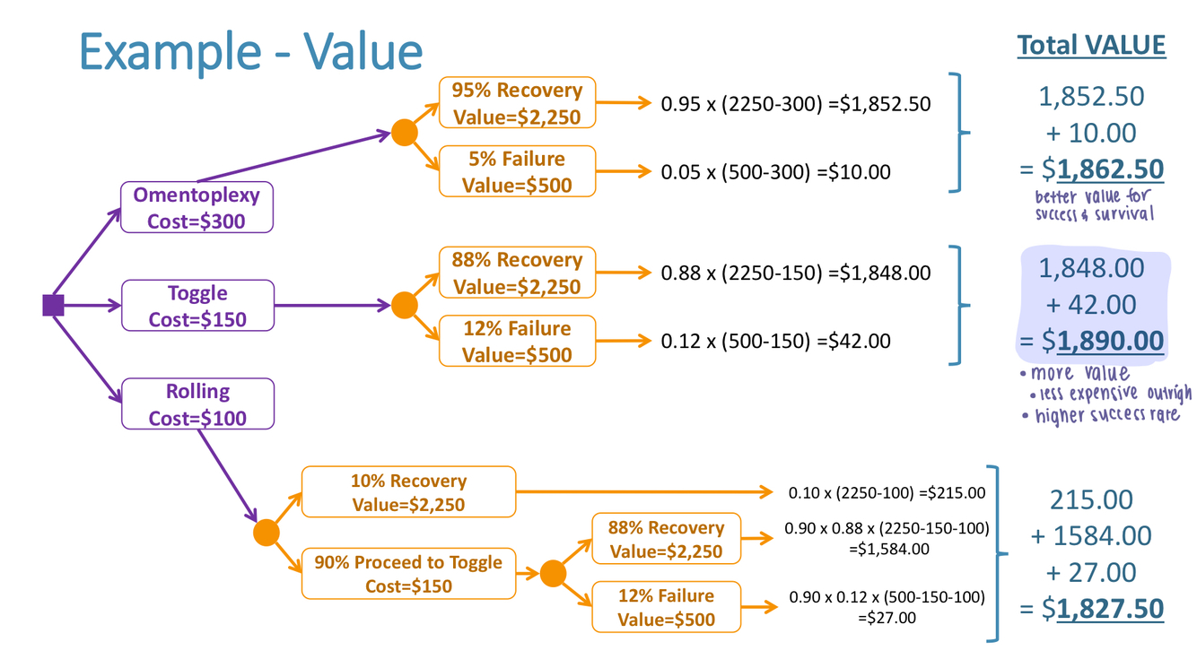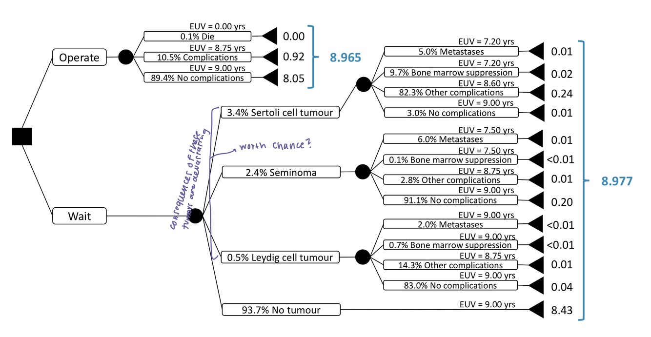 change probabilities and costs/values on a decision tree based on individual skill or new knowledge to see how your decision may change