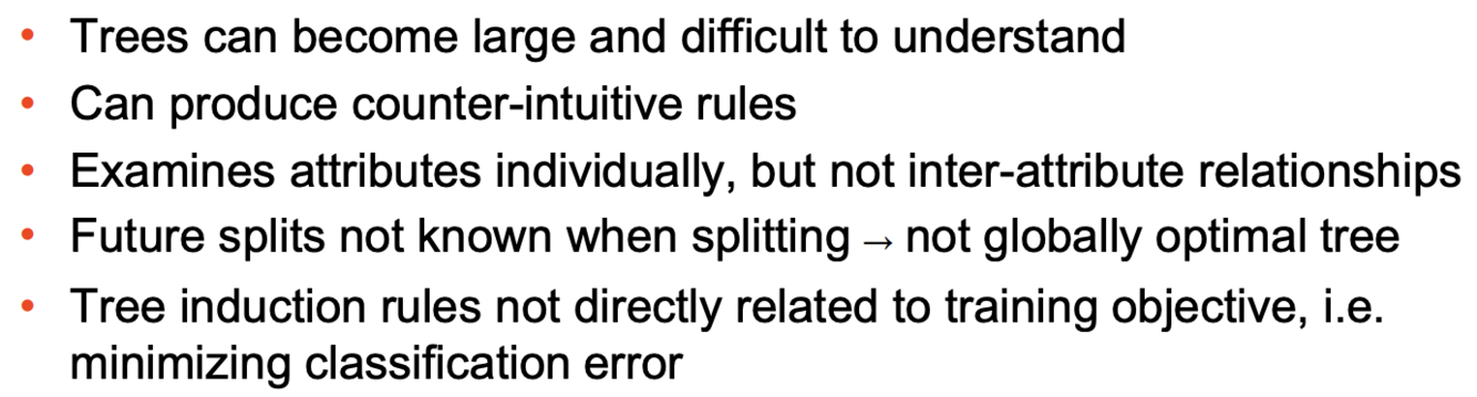 1. Decision trees can only handle discrete or continuous attributes, but no mixed attributes.