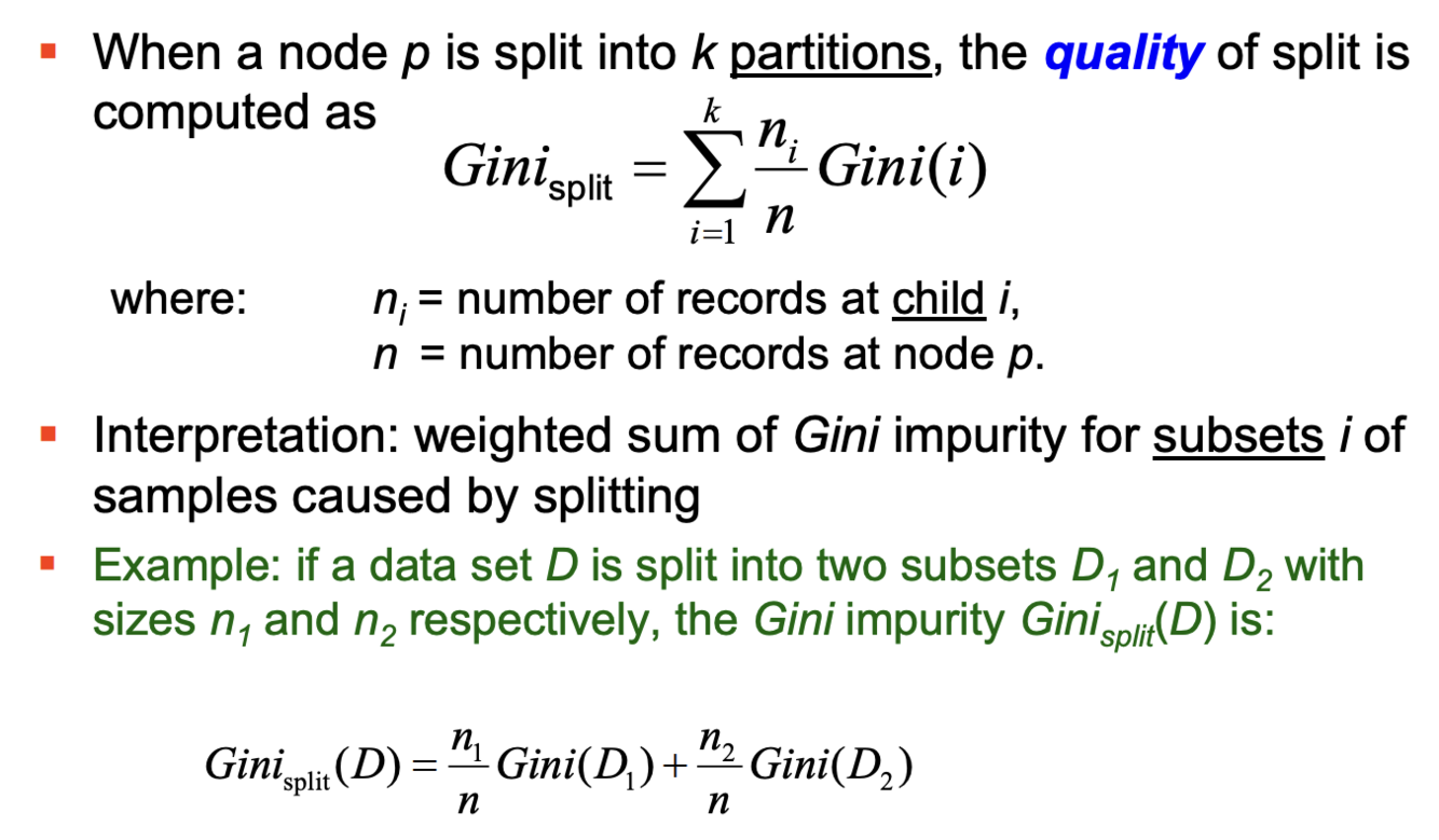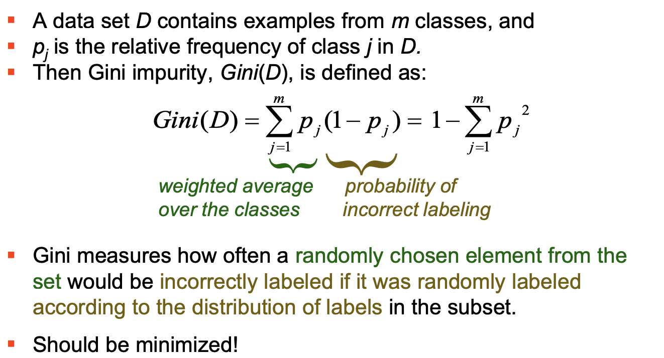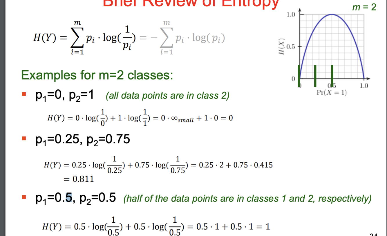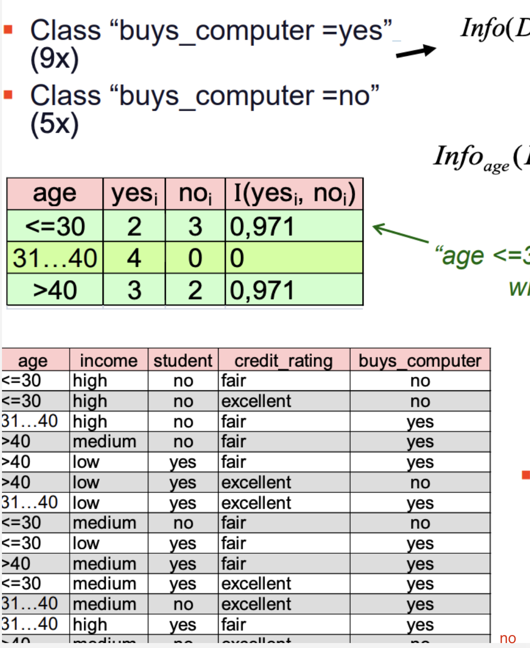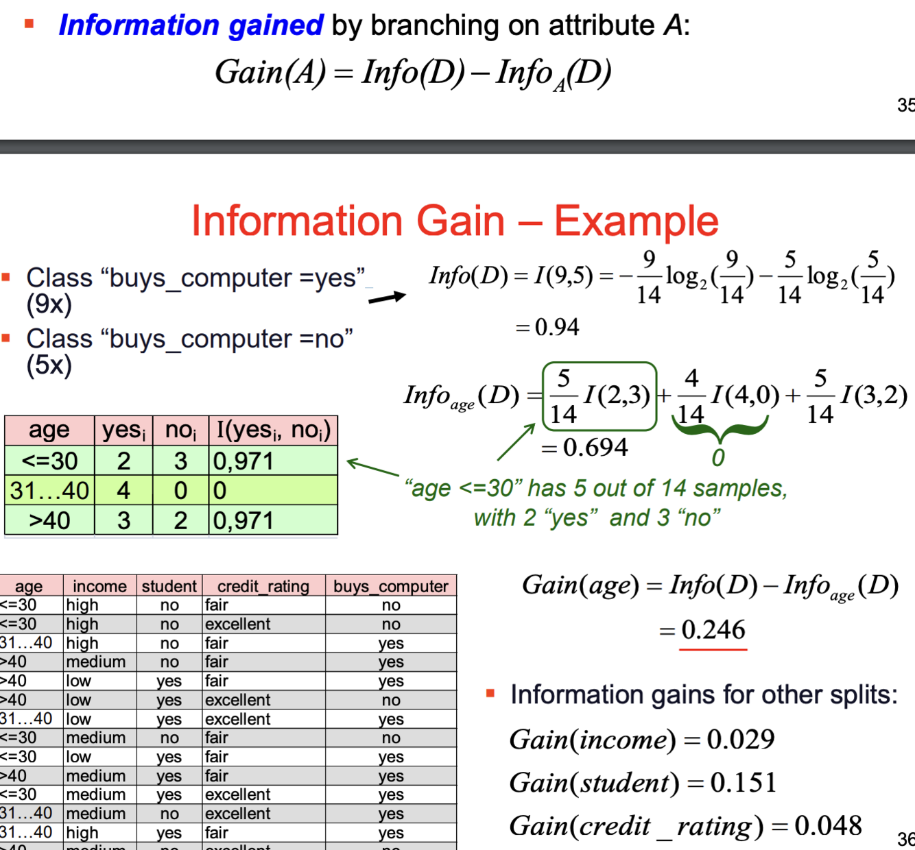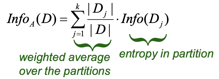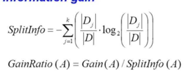 3. Information gain Gain(A) is the difference of the entropy without splitting and the average entropy of the partitions created by using attribute A to split the data.