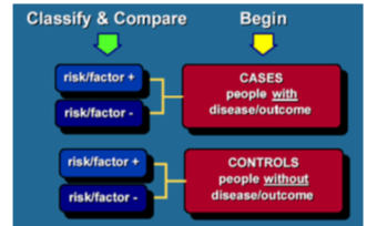 An epidemiological study design where subjects are recruited on the basis of the presence of absence of disease (case and controls) and exposure is measured retrospectively. In this way it is possible to estimate the risk of disease associated with expsoure usually by calculating an odds ratio.