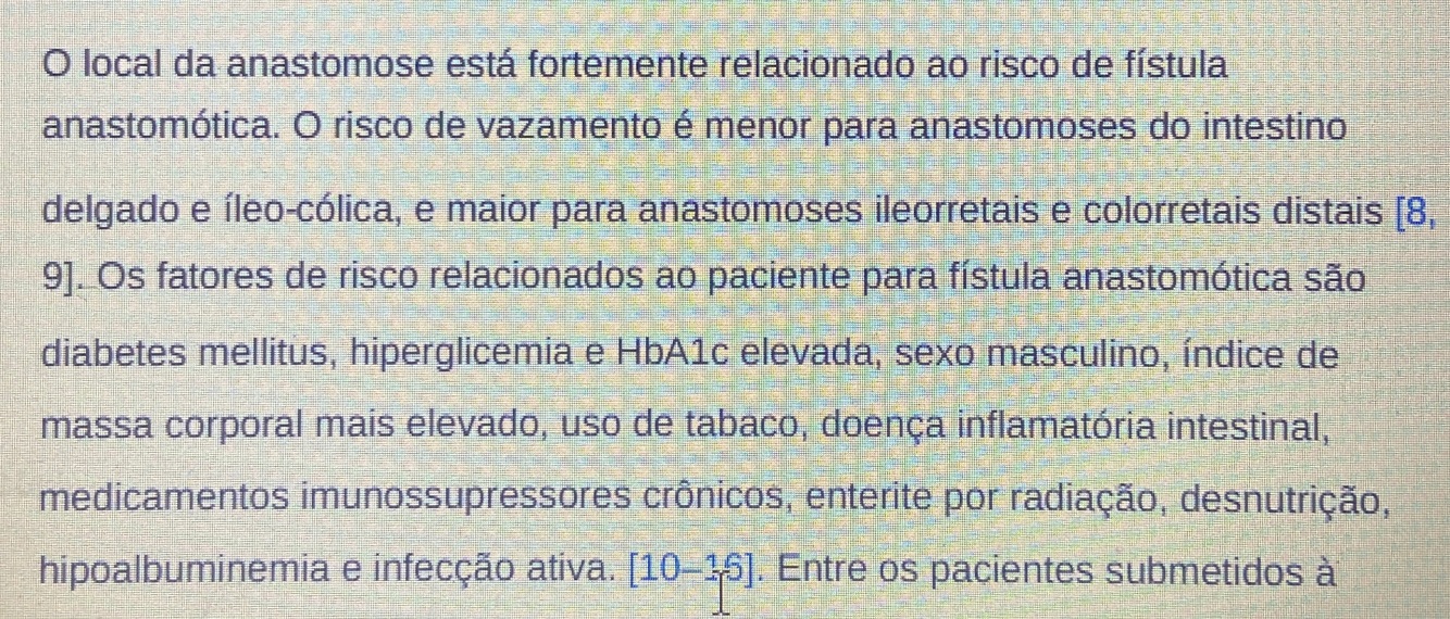 A avaliação da perfusão do cólon pode ser realizada com fluorescência com indocianina verde, mas é subjetiva e não avalia a drenagem venosa.