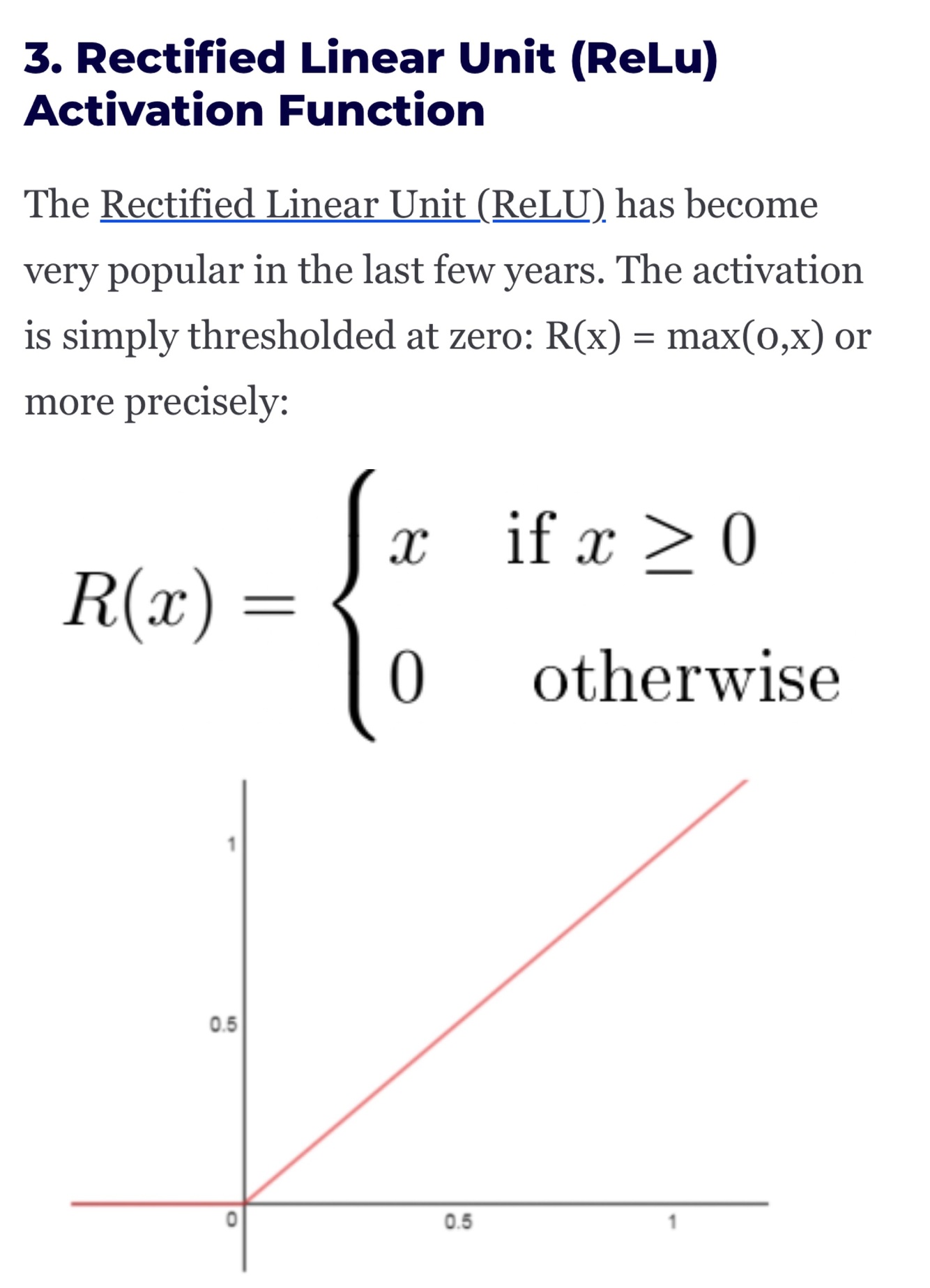 Does not saturate, computationally inefficient, and still converted faster than sigmoid and tanh.