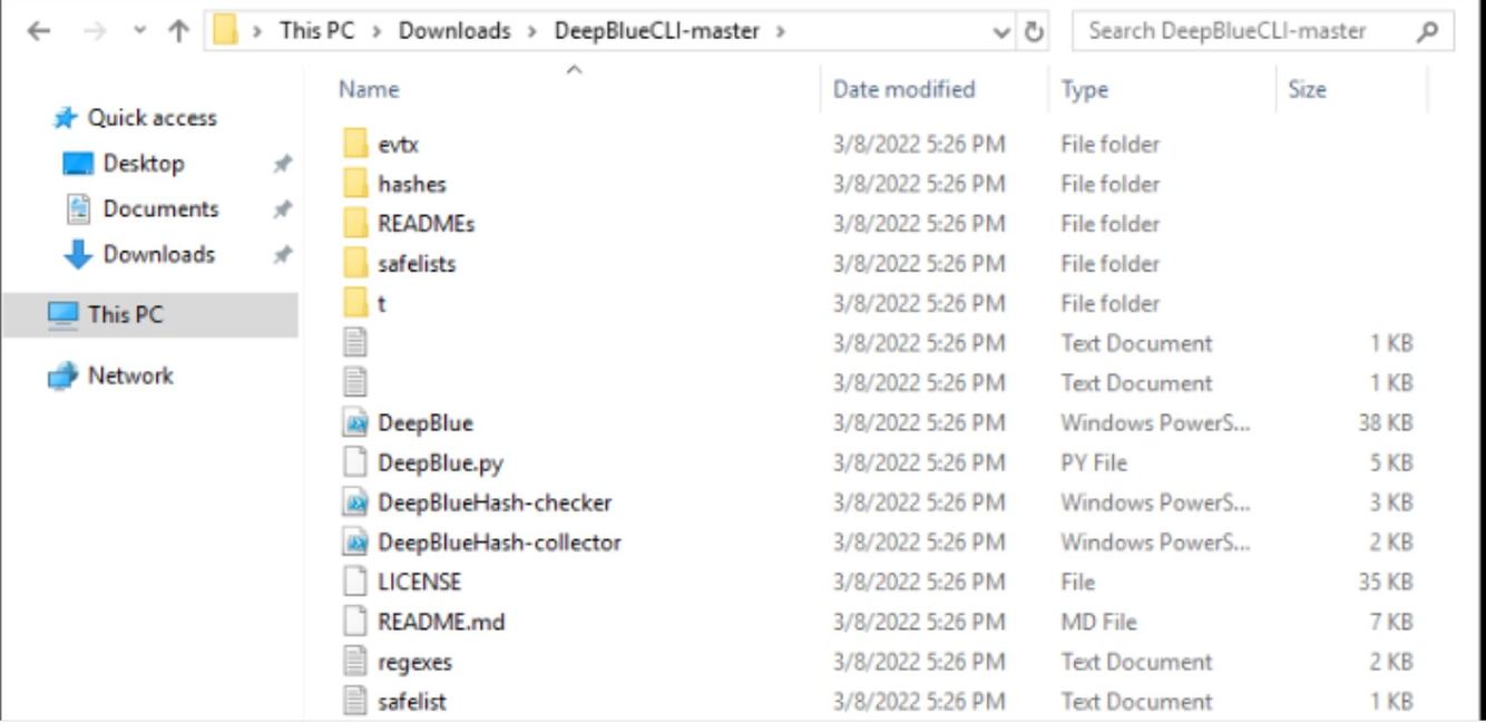 Inside the folder are all the files related to the tool, including the core PowerShell script “DeepBlue” (DeepBlue.ps1).