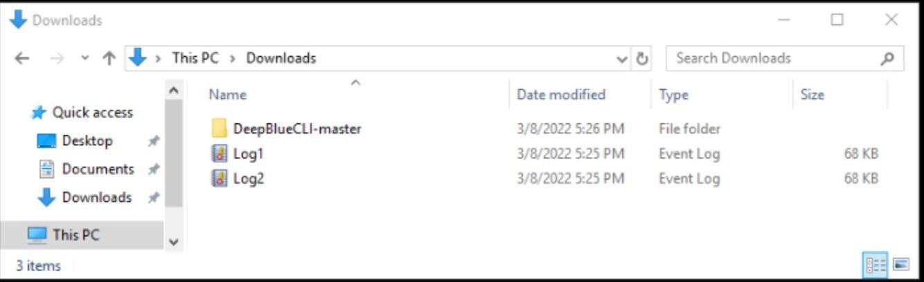 In our Downloads folder, we have the DeepBlueCLI folder downloaded from Github and 2 log files that we’re going to analyze.