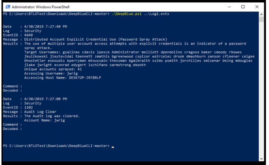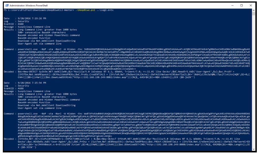 DeepBlue is a very simple tool to use and allows us to identify suspicious events using pre-determined signatures and patterns from Windows Event logs without having to manually dig through them in Event Viewer or another program.