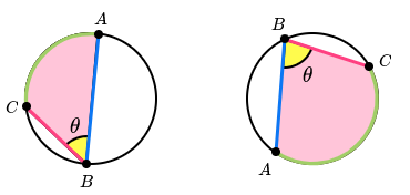 An angle within a circle is created by two chords meeting at a point on the circumference. The diagrams below show the angle subtended by arc AC from point B for two different circles.