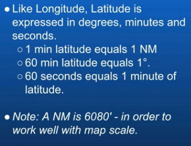 **Lines of longitude do not have 1NM increments because as you get closer to the poles the lines get closer together. Lines of longitude can only be one NM apart at exactly the equator.