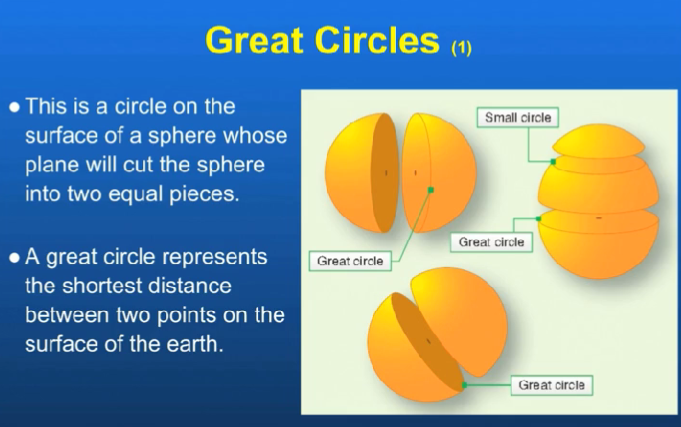 Great Circles cut a globe/sphere in half to give two equal halves. It represents the shortest distance between two points