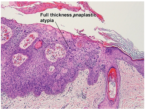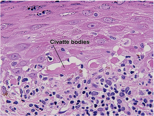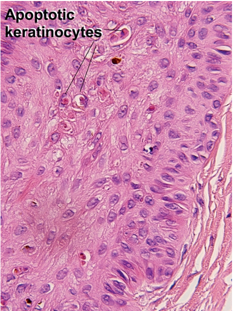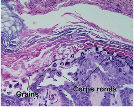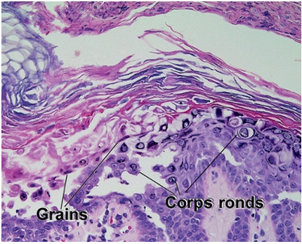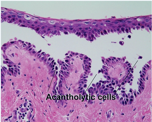 rounded nucleus with halo of pink dyskeratotic cytoplasm (ex: Darier)