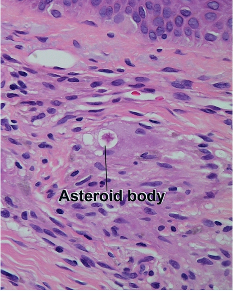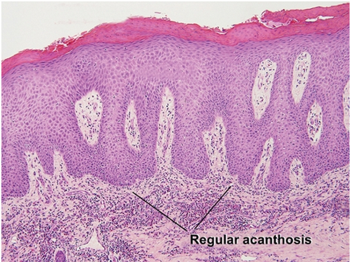 dark blue flattened nucleus surrounded by minimal cytoplasm (ex: Darier’s)