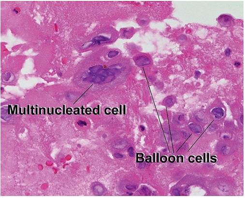 Pink intranuclear inclusions - Cowdry A: herpesvirus - Cowdry B: adenovirus, poliovirus
