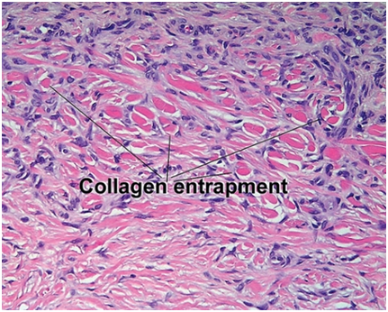Collagen fibers surrounded by histiocytes/spindle cells (ex: dermatofibroma)