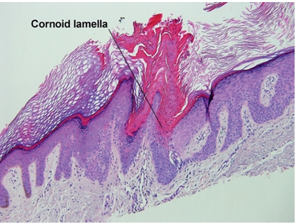 Parakeratosis in a column above hypogranulosis and pink dyskeratotic keratinocytes at base (ex: porokeratosis)