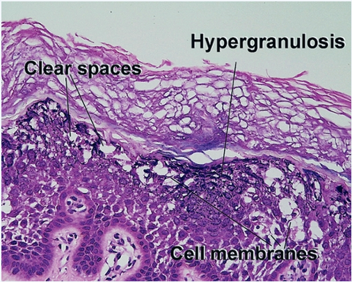 disruption of cell membranes –> coarse, irregular hypergranulosis