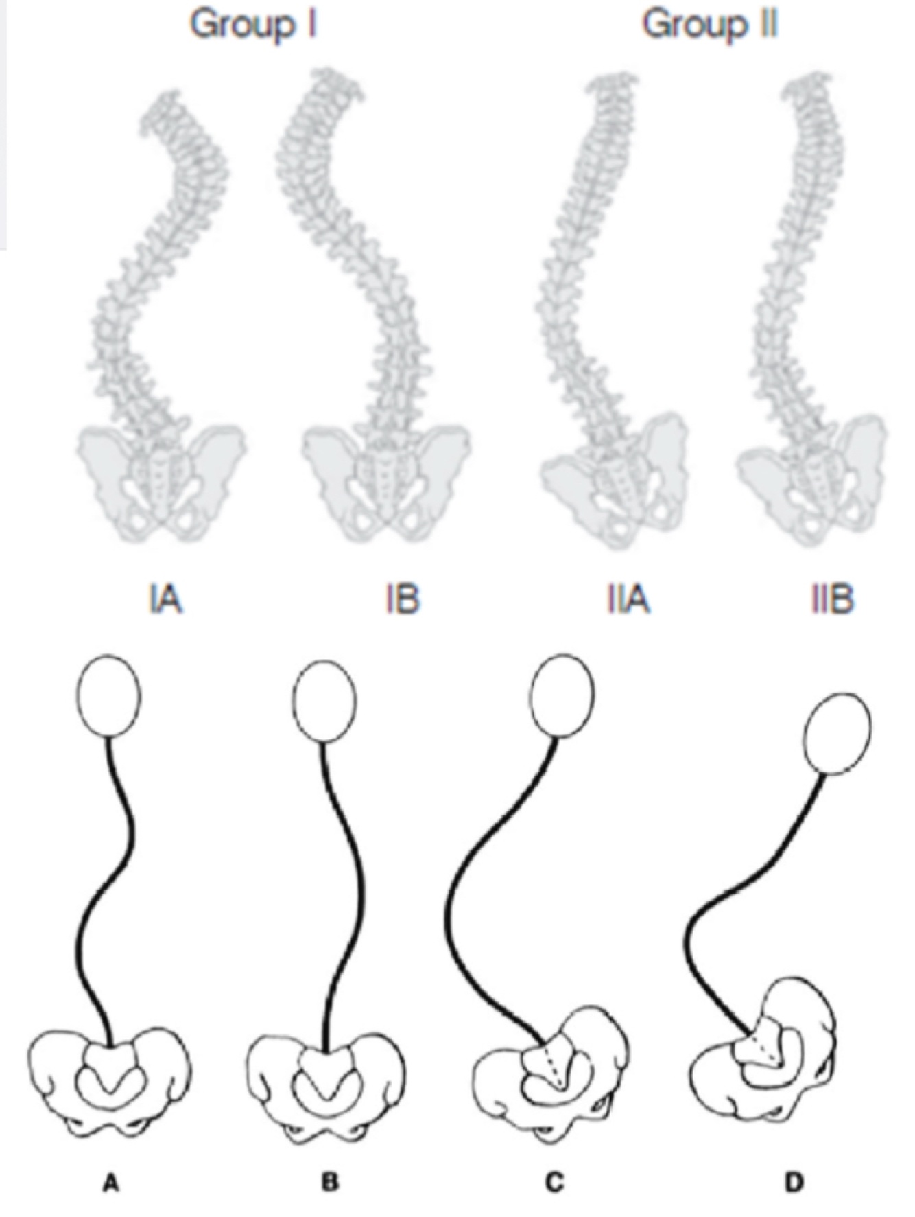 IIA (curva curta acima sacro); IIB (sacro faz parte da curva)