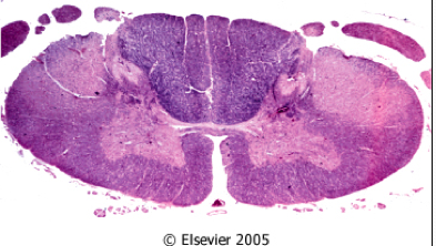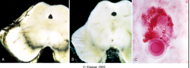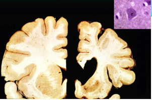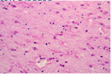 There is loss of neurons (especially small, spiny neurons). Prominent gliosis is present.
