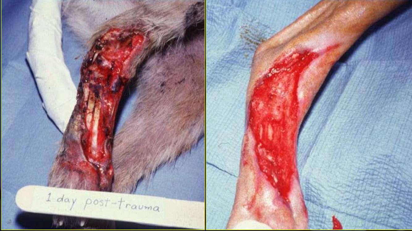 debridement to remove all devitalized bone and soft tissue and provide drainage or stabilization of fracture, if needed