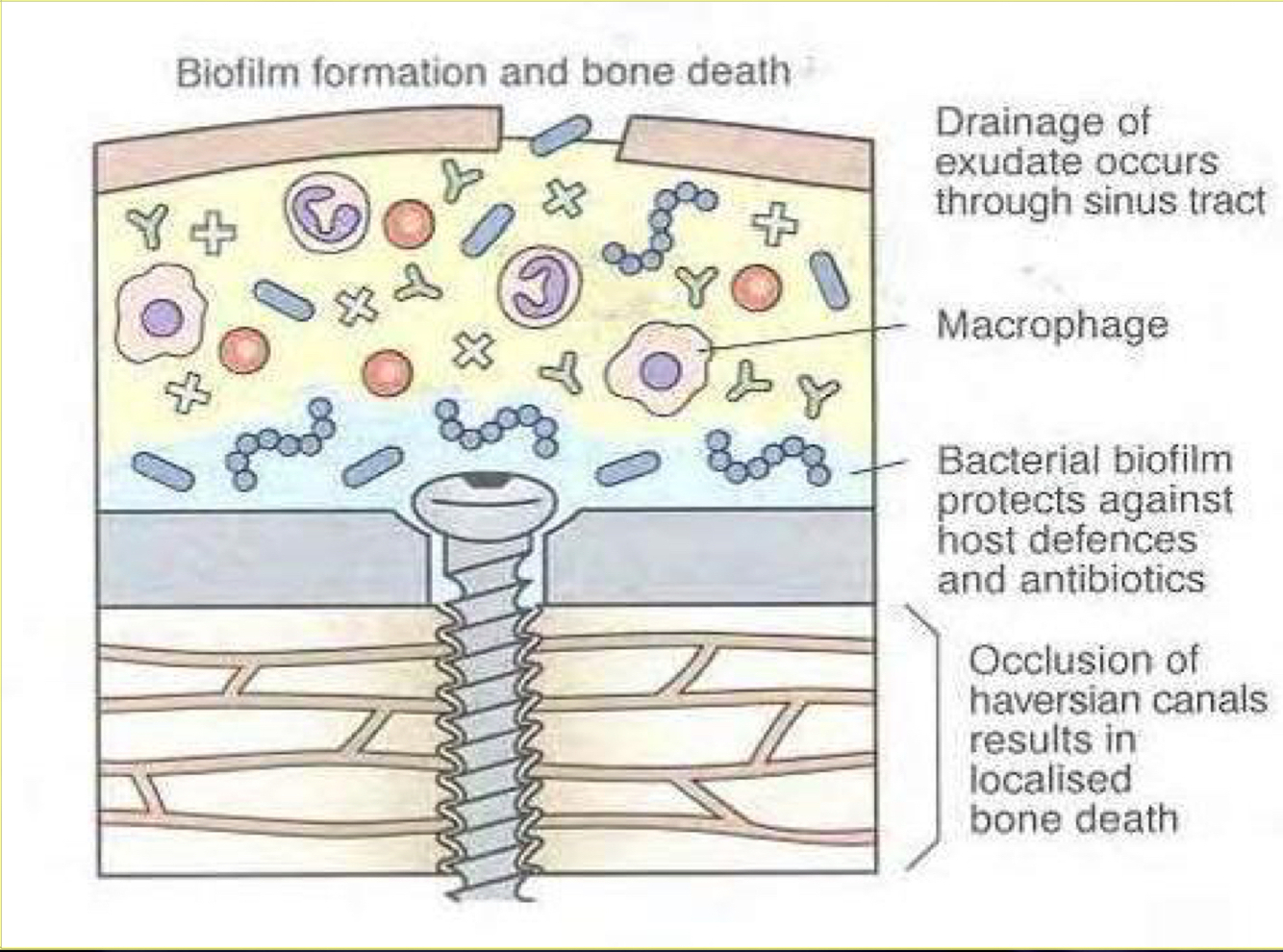 What 4 factors are required for iatrogenic osteomyelitis development?