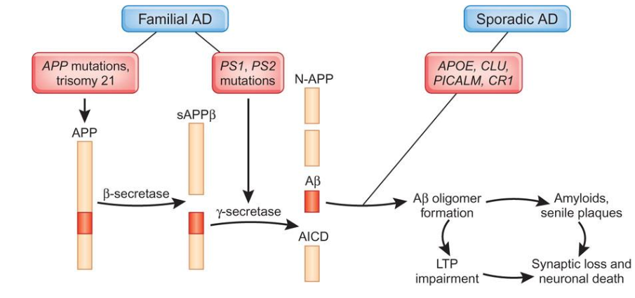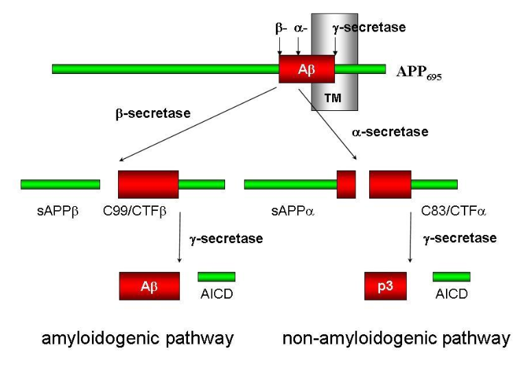 Štěpení APP - schéma (jaké sekretázy, na jaké produkty)