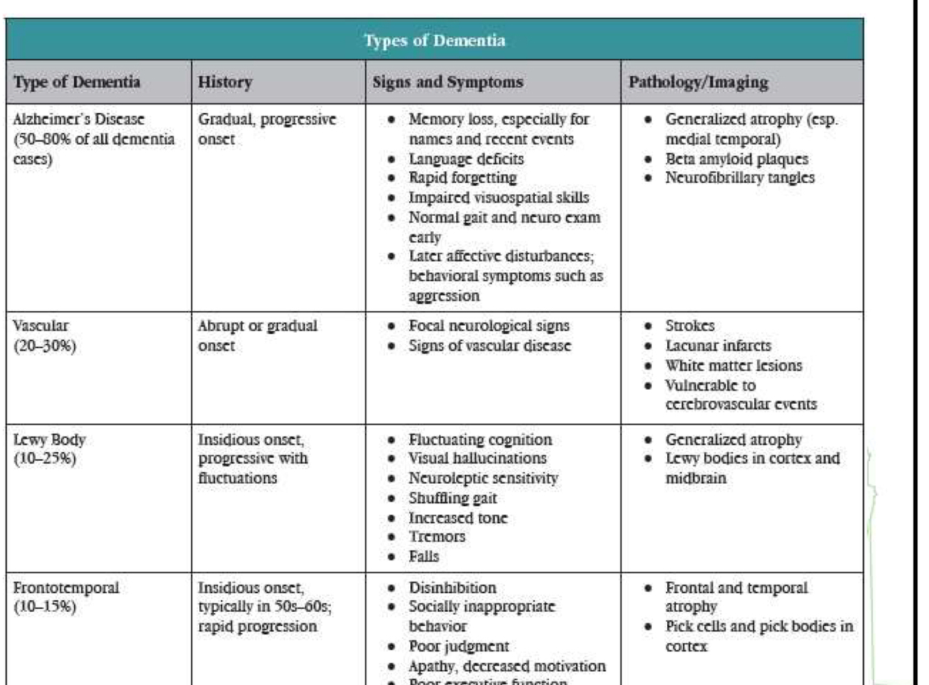 what are the symptoms for each type of dementia?