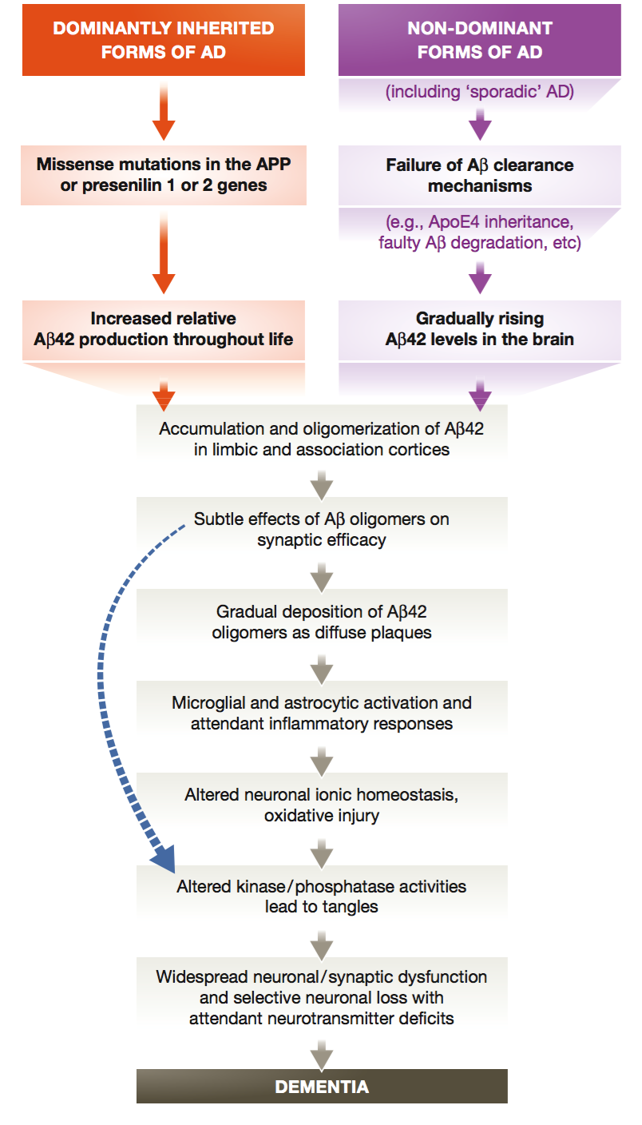 AB42 binds to post synaptic a7 nicotinic receptor Cascade of events lead to phosphorylation of tyr472 on NMDA receptor => phosphorylation and endocytosis Altered kinase and phosphotase activity leads to phosphorylation of tau and tangle formation- these can make it into blood vessels=> immune response => neuronal loss by microglia