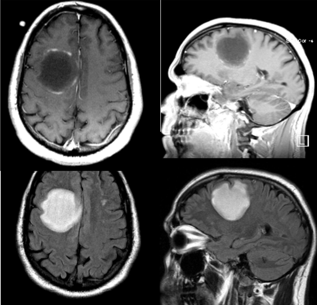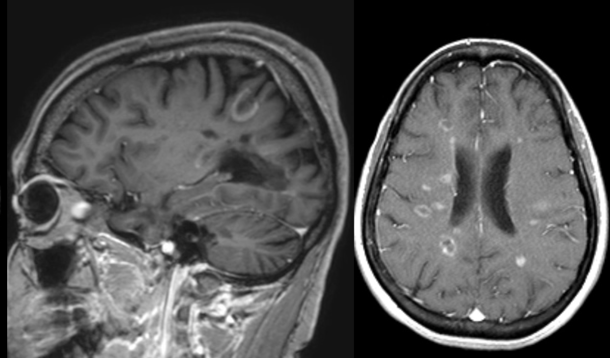 A 50 year-old man developed personality changes and subtle left-sided weakness.