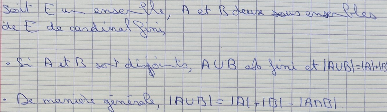 Soit E un ensemble, A et B deux sous-ensembles de E de cardinaux finis, donner le cardinal de AUB (dans le cas général et dans le cas A et B disjoint)