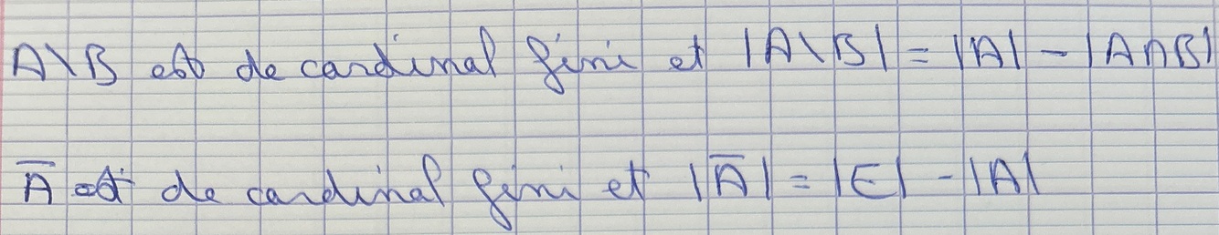 Soit E un ensemble, A et B deux sous-ensembles de E de cardinaux finis, donner le cardinal de A\B et /A