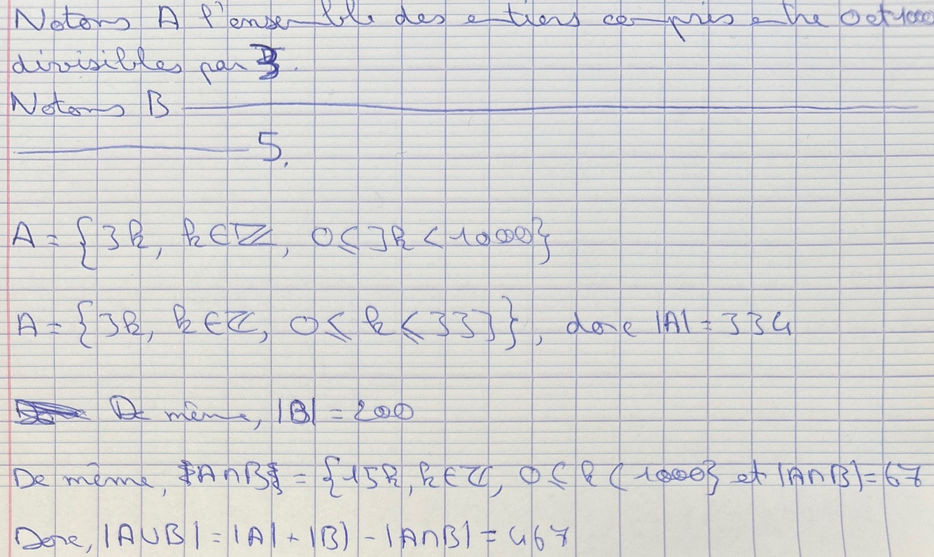 Déterminer le nombre d’entiers plus petits strictement que 1000 et divisibles par 3 ou 5