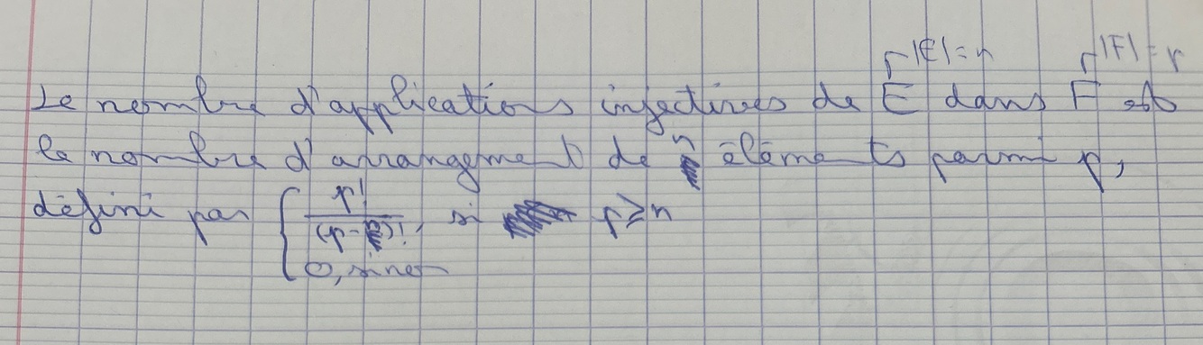 Donner le nombre d’applications injectives de E dans F, |E|=n et |F|=p