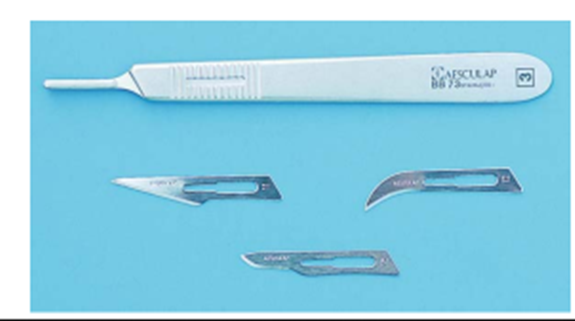 -Scalpel- Blades: 10(skin incision), 11 (stab incision), 12 (mucogingival procedures), 15 (intraoral surgery)