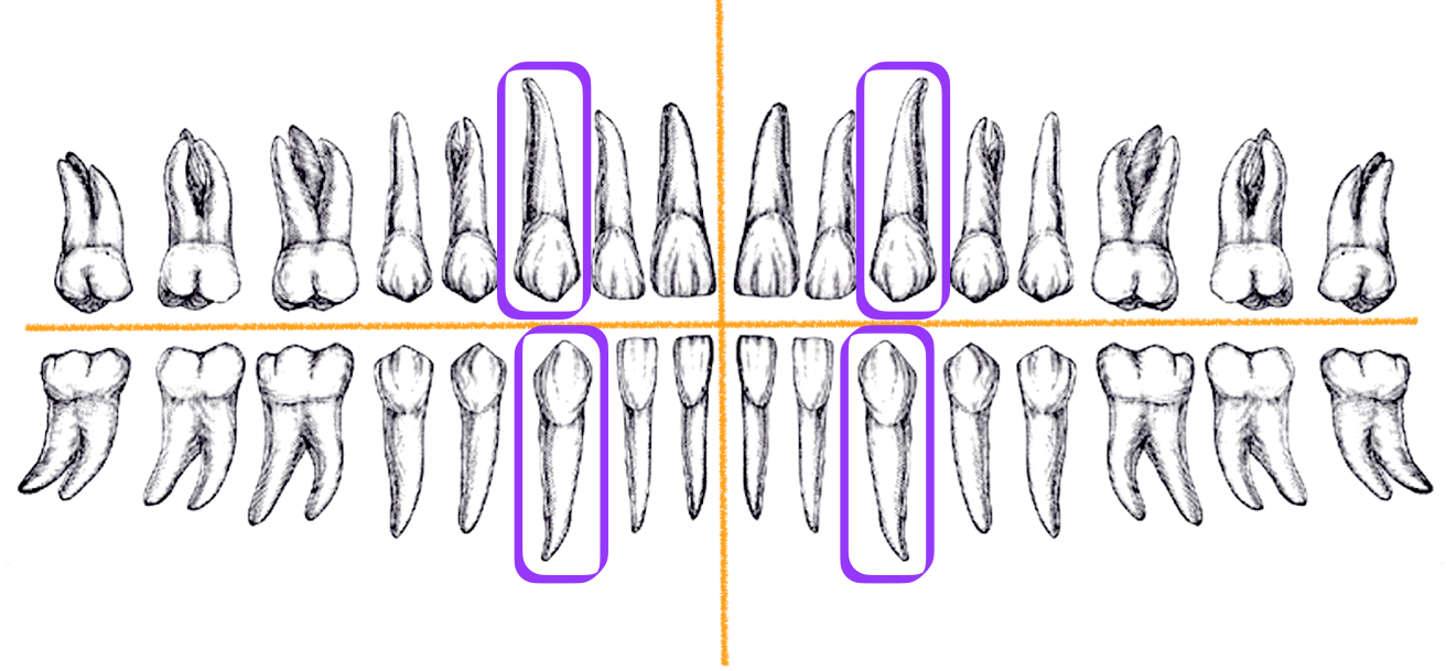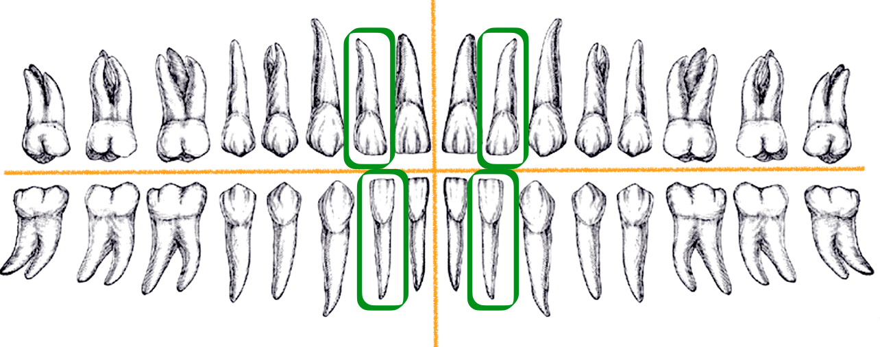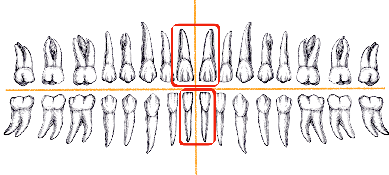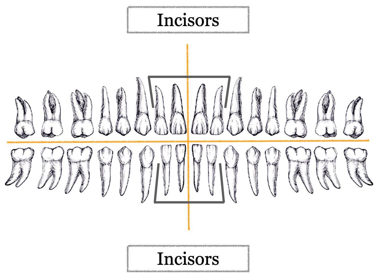 There are two central incisors in the upper arch and two central incisors in the lower arch.