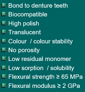 list the requirements of denture base materials
