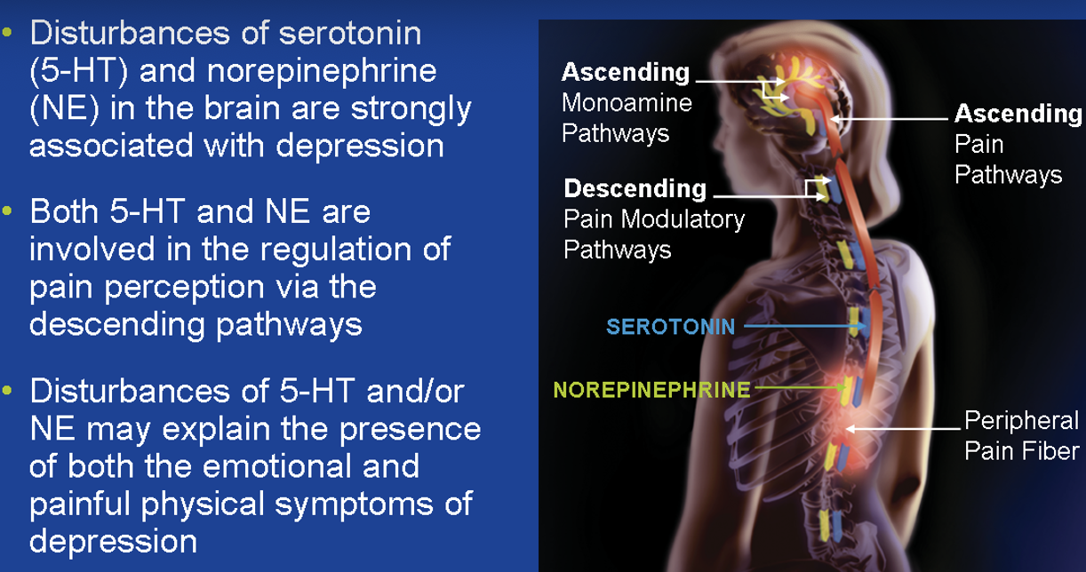 5-HT & NE are involved in pain perception → depression decreases these → more pain is preceived