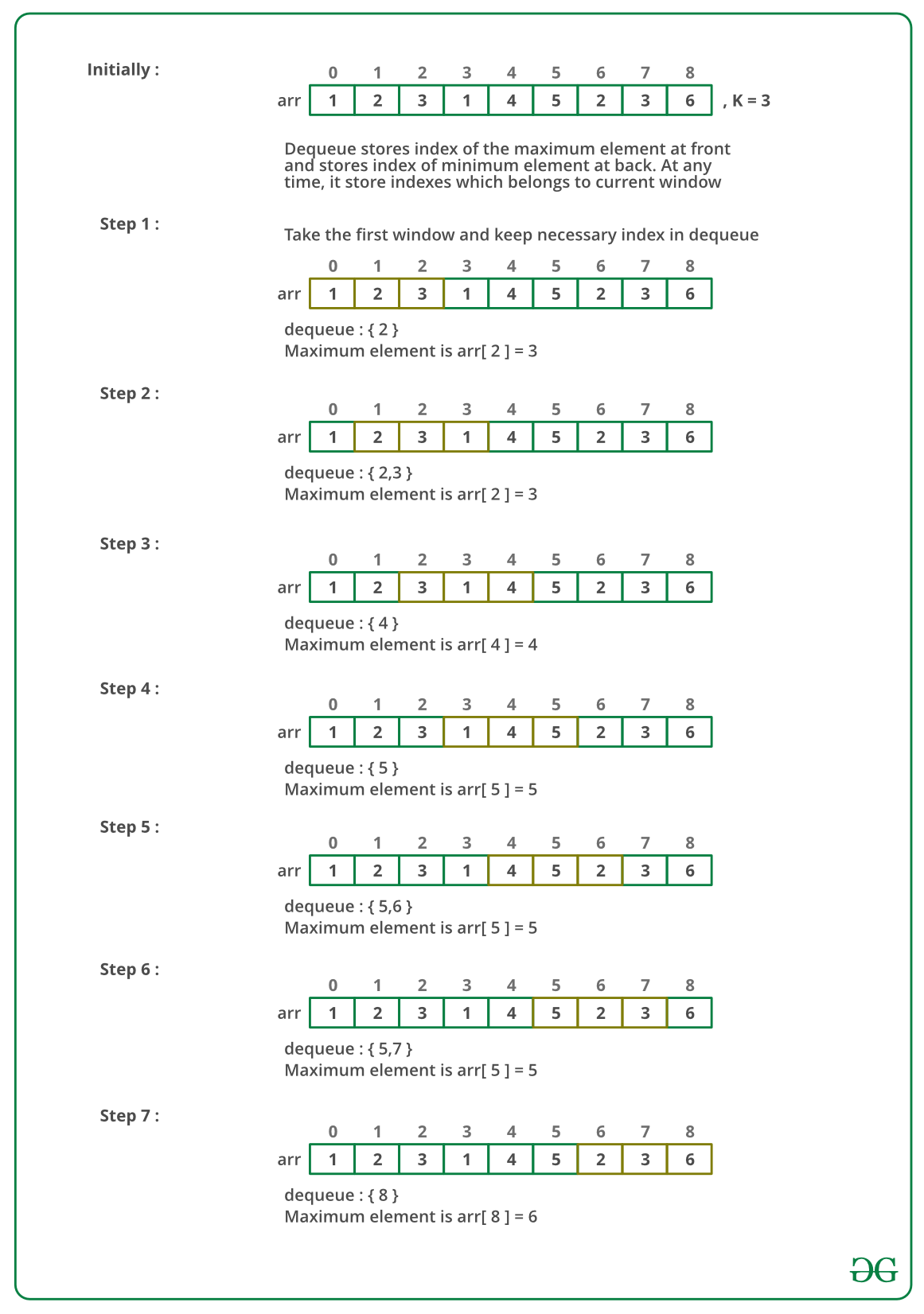 Solution (A O(n) method: using Deque): We create a Deque, Qi of capacity k, that stores only useful elements of current window of k elements. An element is useful if it is in the current window and is greater than all other elements on the left side of it in the current window. We process all array elements one by one and maintain Qi to contain useful elements of the current window and these useful elements are maintained in sorted order. The element at front of the Qi is the largest and element at rear of Qi is the smallest of current window.
