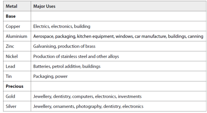 Uses of Metals table